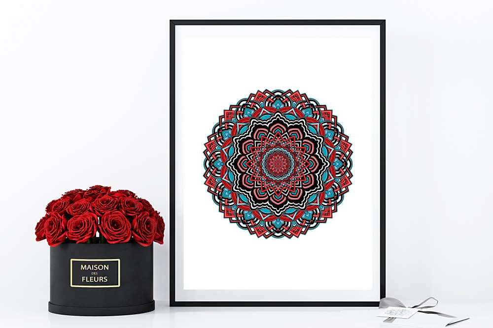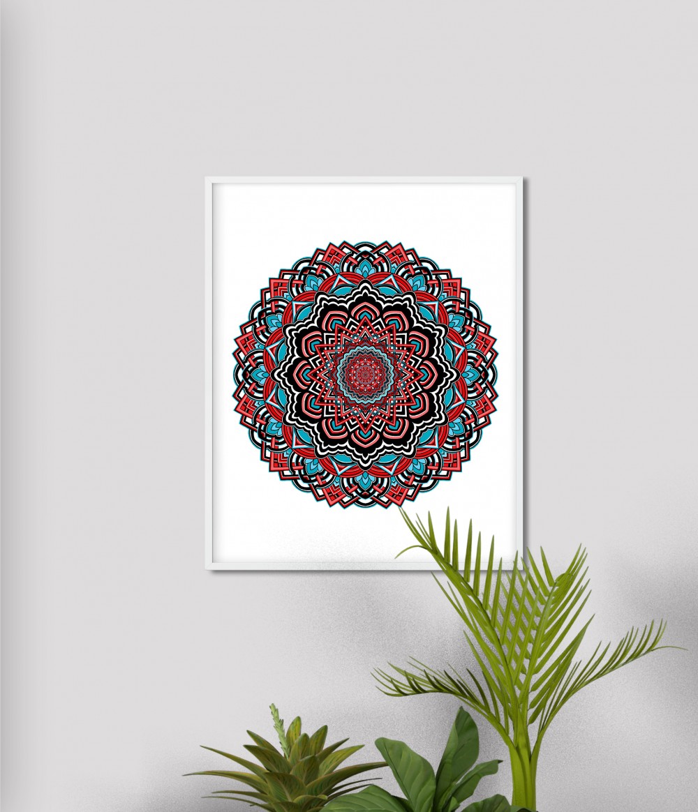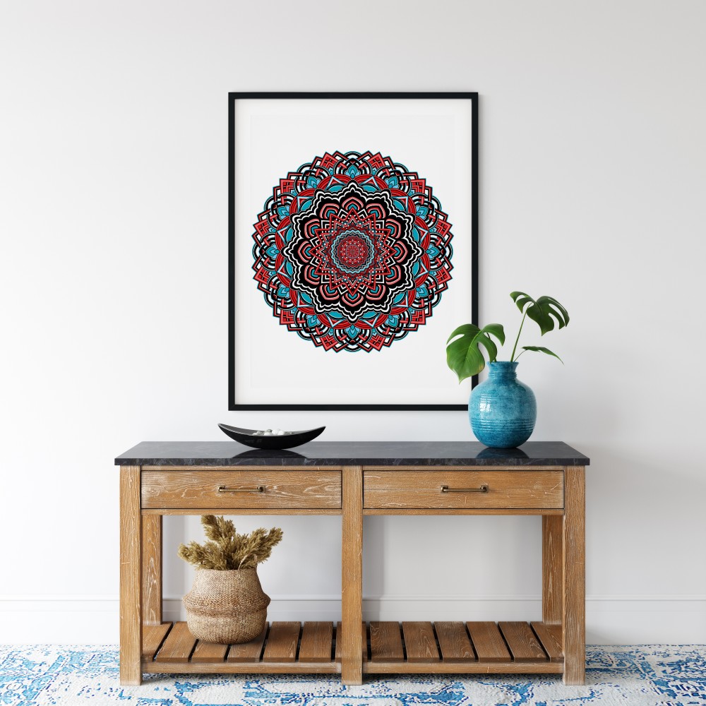If you want to add some energetic glow to your interior and make it alive, red and turquoise will be a good choice. Red is the colour of the greatest intensity. It impacts your body and carries a huge dose of energy & strength. Turquoise gives the impression of freshness, and in combination with red, they create an energetic & exotic duo. Choosing the colour range for this mandala, I was inspired by colours that reminded me of Native American jewellery.