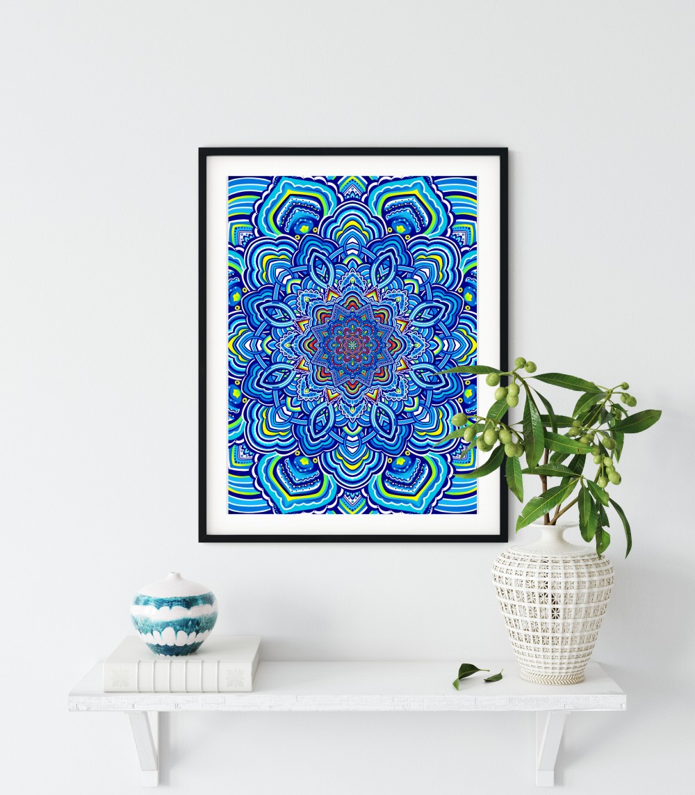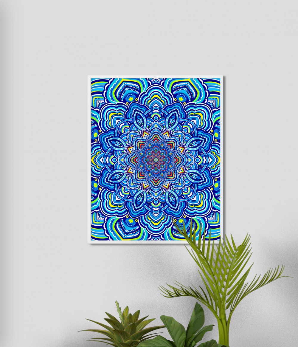 Autorski wzór mandali zainspirowany piękną, grecką wyspą Santorini i jej białymi domami z niebieskimi kopułami. Kolor niebieski wprowadzi ukojenie i relaks do wnętrza i będzie przywodził na myśl morskie klimaty. Wersja z dodatkiem czerwieni i zielonego koloru.