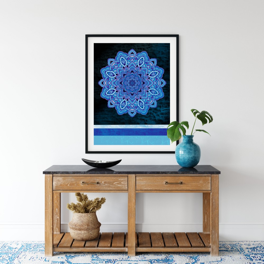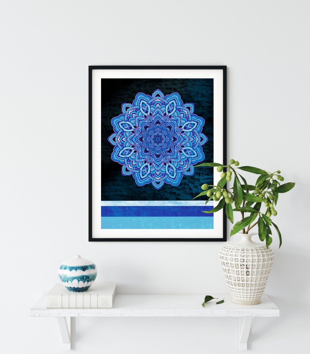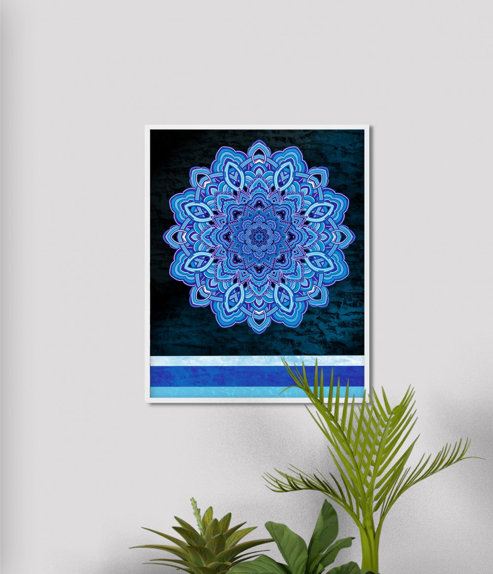 Autorski wzór mandali zainspirowany piękną, grecką wyspą Santorini i jej białymi domami z niebieskimi kopułami. Kolor niebieski wprowadzi ukojenie i relaks do wnętrza i będzie przywodził na myśl morskie klimaty. Wersja dla osób lubiących abstrakcje, ciekawe połączenie prostych form ze wzorami mandali. Doda do wnętrza oryginalności i tajemniczości.