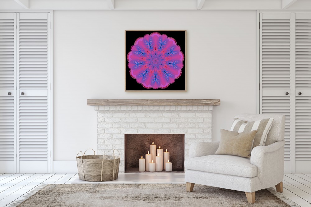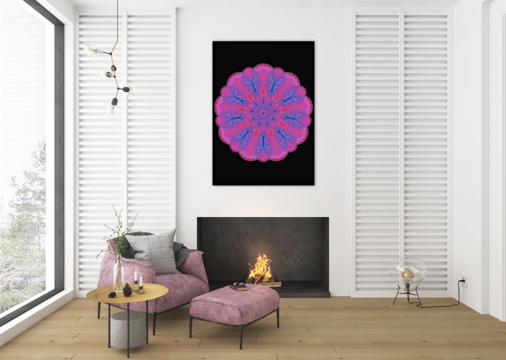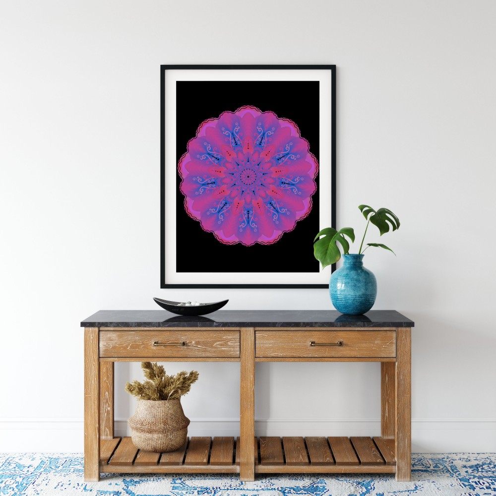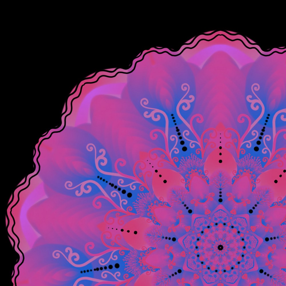 Autorski wzór mandali. Połączenie fuksji i niebieskiego tworzy tajemniczy i intrygujący klimat. Motywy mandali zostały zainspirowane podwodnym światem. Występuje również w wersji na czarnym tle.