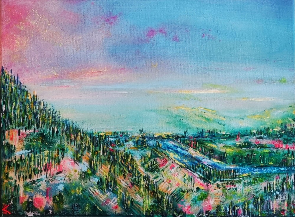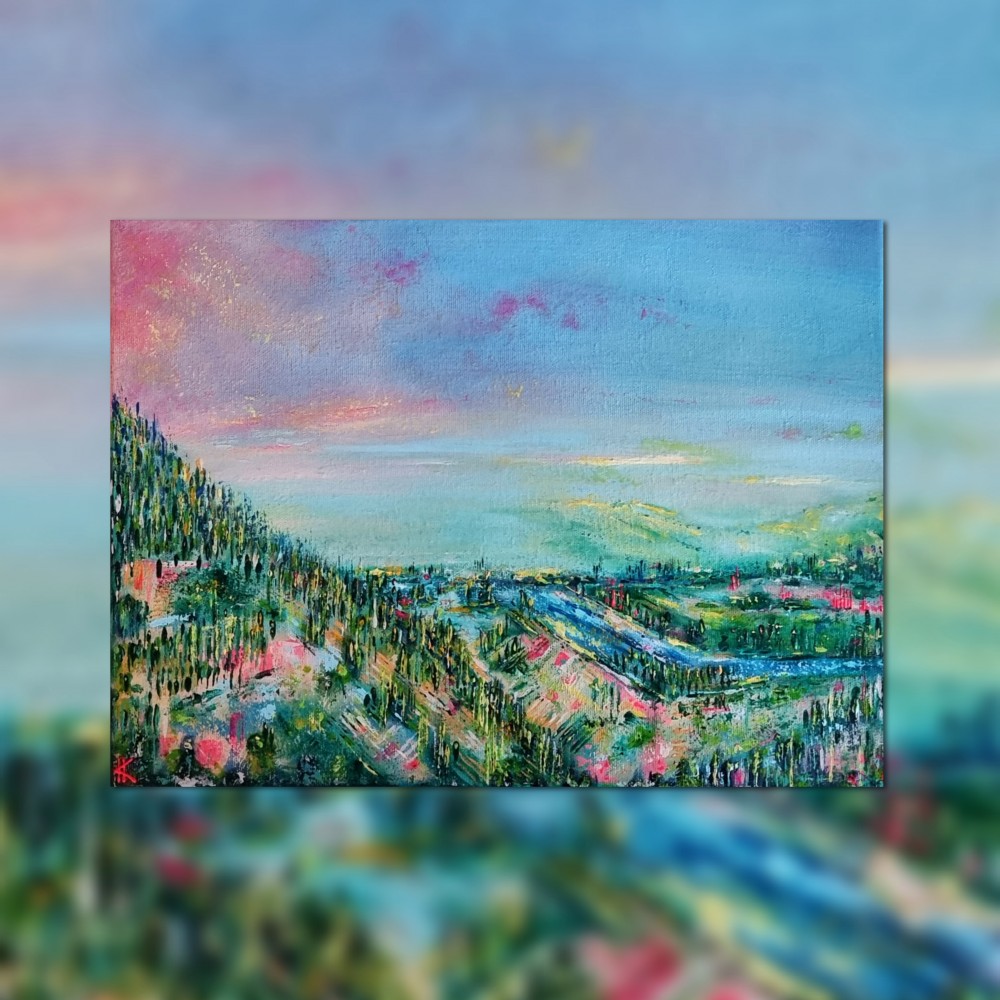 Semiabstrakcyjny pejzaż akrylowy namalowany na bawełnianym płótnie.