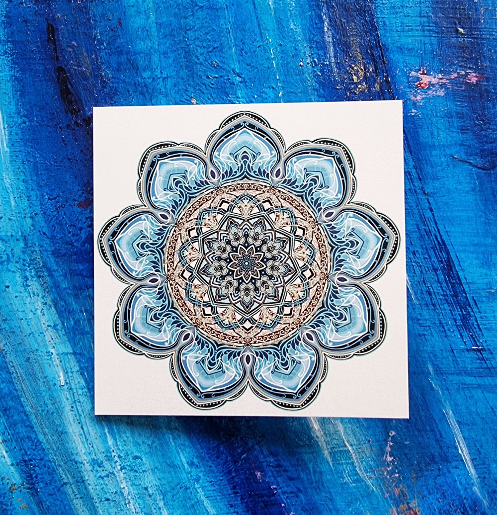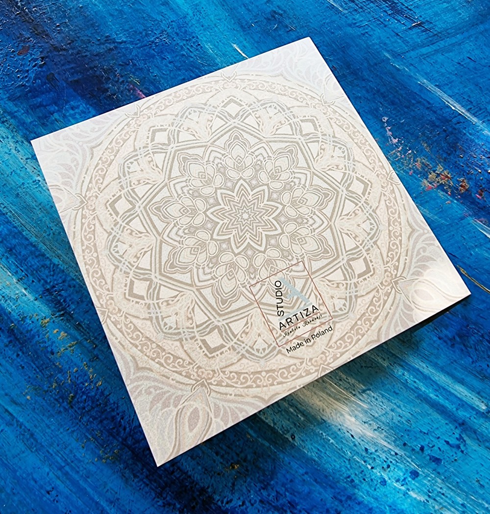 Otwierana kartka na każdą okazję z autorskim projektem mandali, drukowana w Polsce na pięknym, perłowym papierze. Do kartki dołączona jest pasująca koperta.