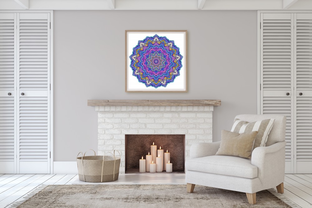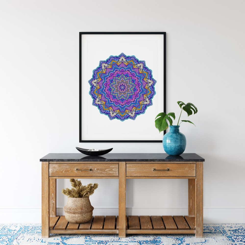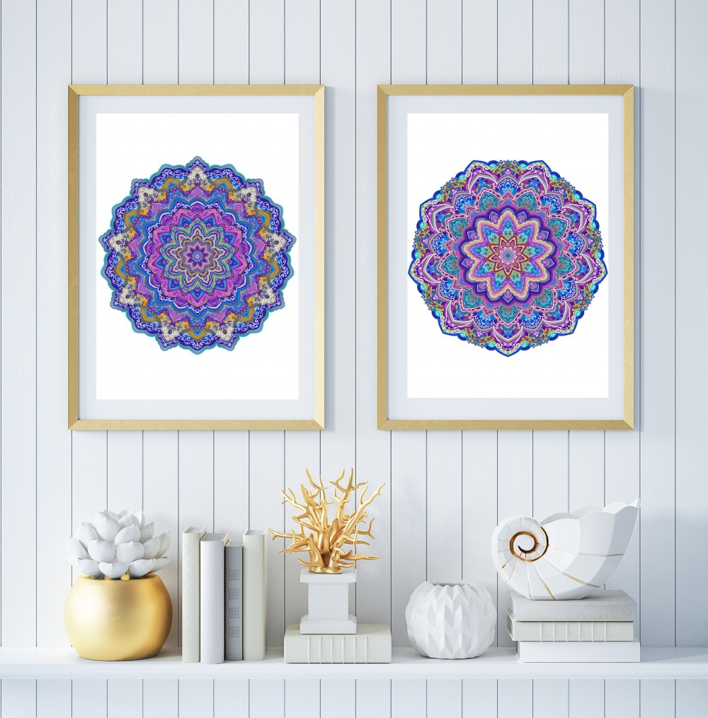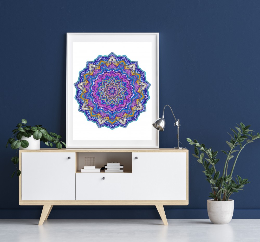 Autorski wzór mandali ′Delikatność uczuć′ to połączenie odcieni: fioletowego, niebieskiego, szarego i złotego. Zestawienie tych kolorów wprowadzi balans między ożywieniem a spokojem oraz pobudzi kreatywność.