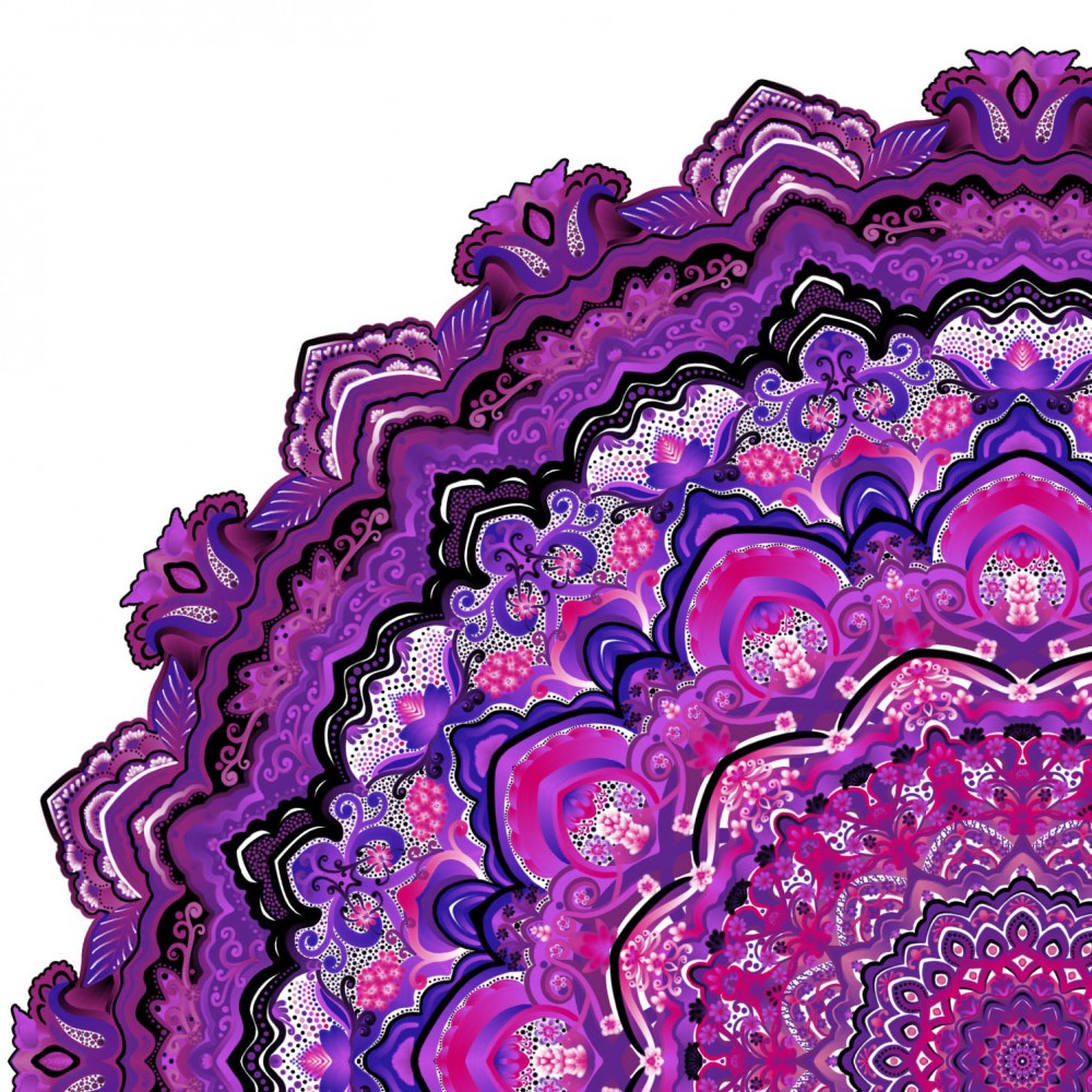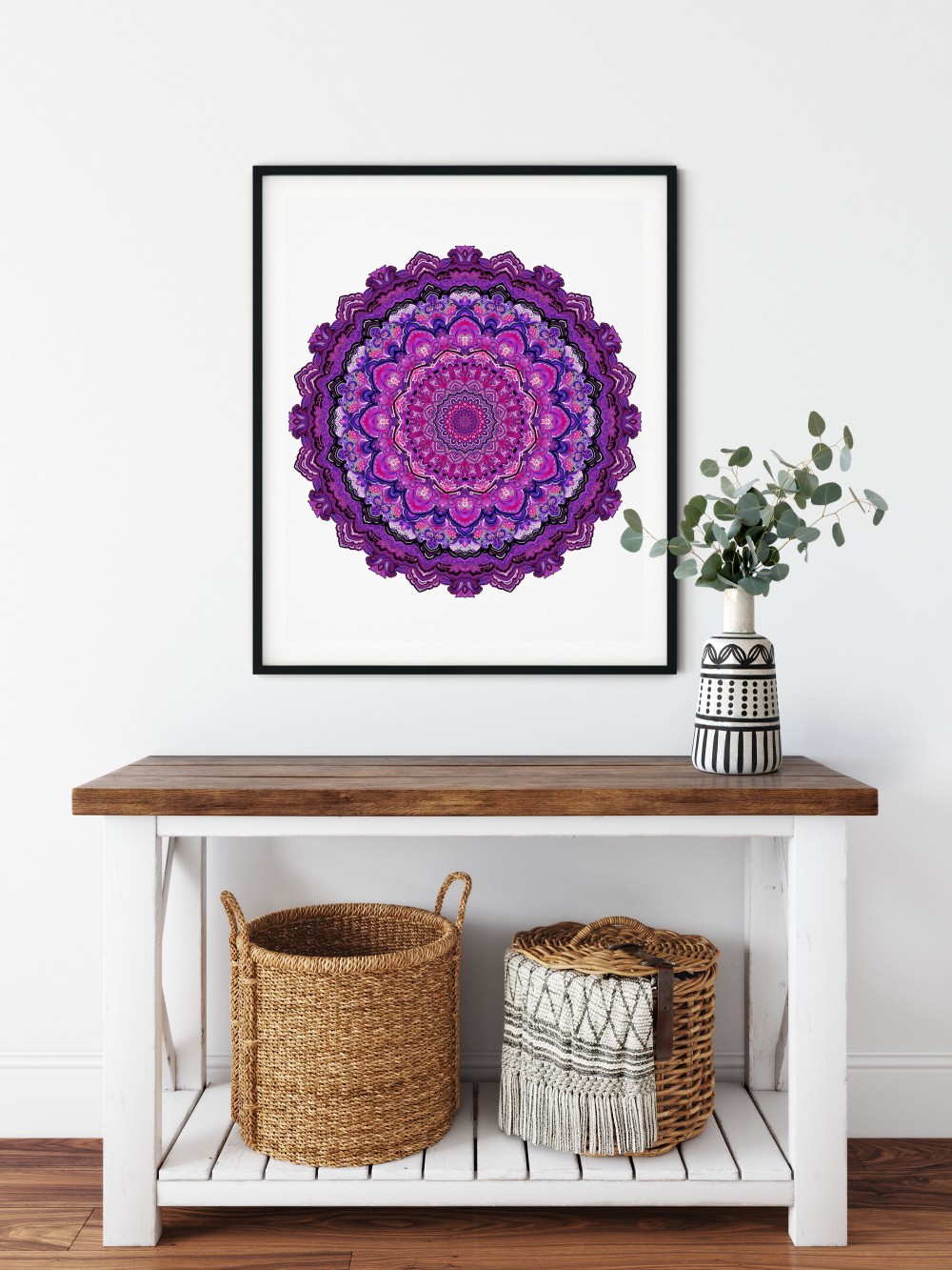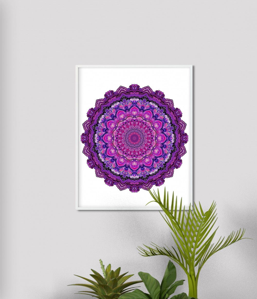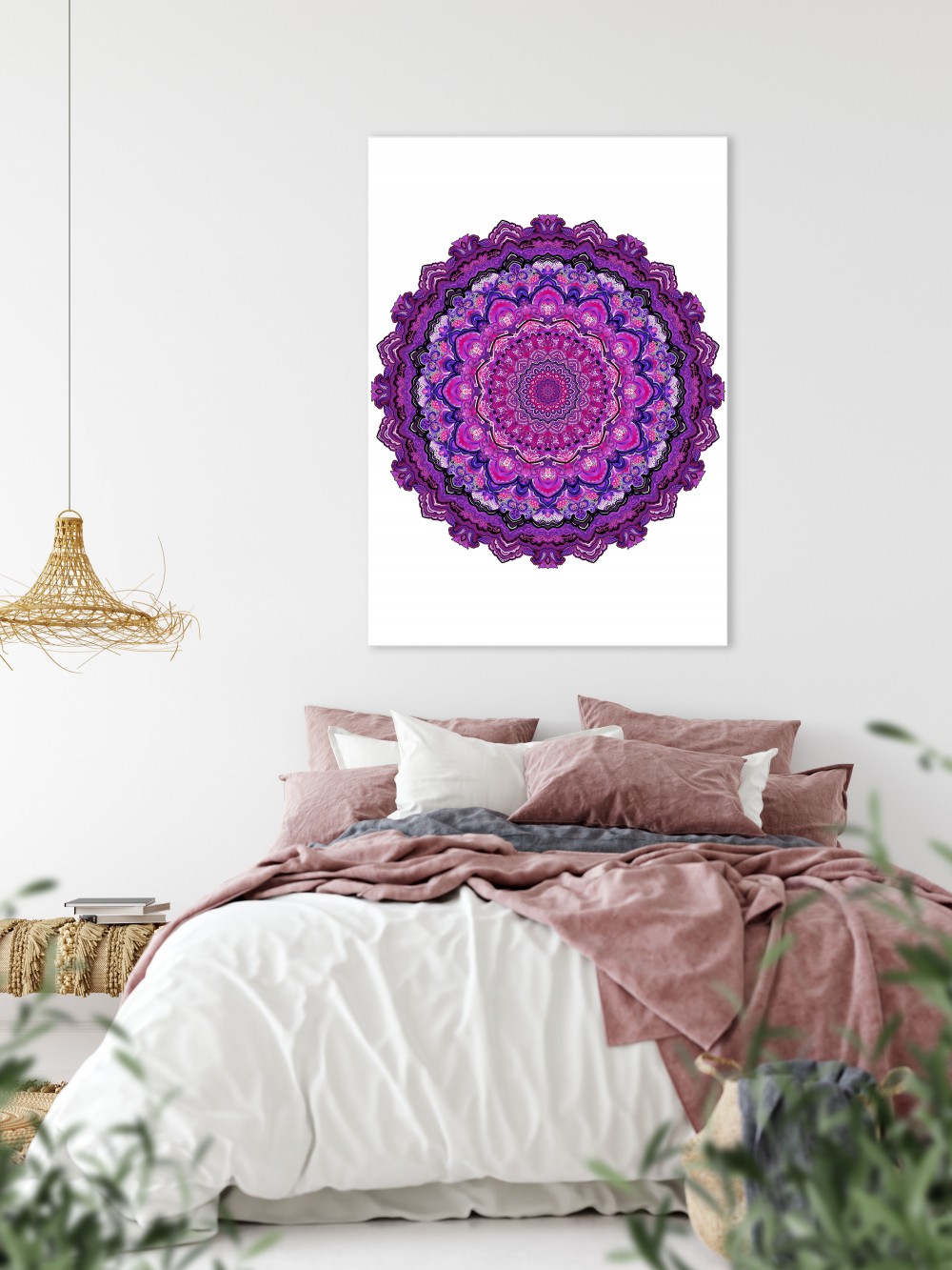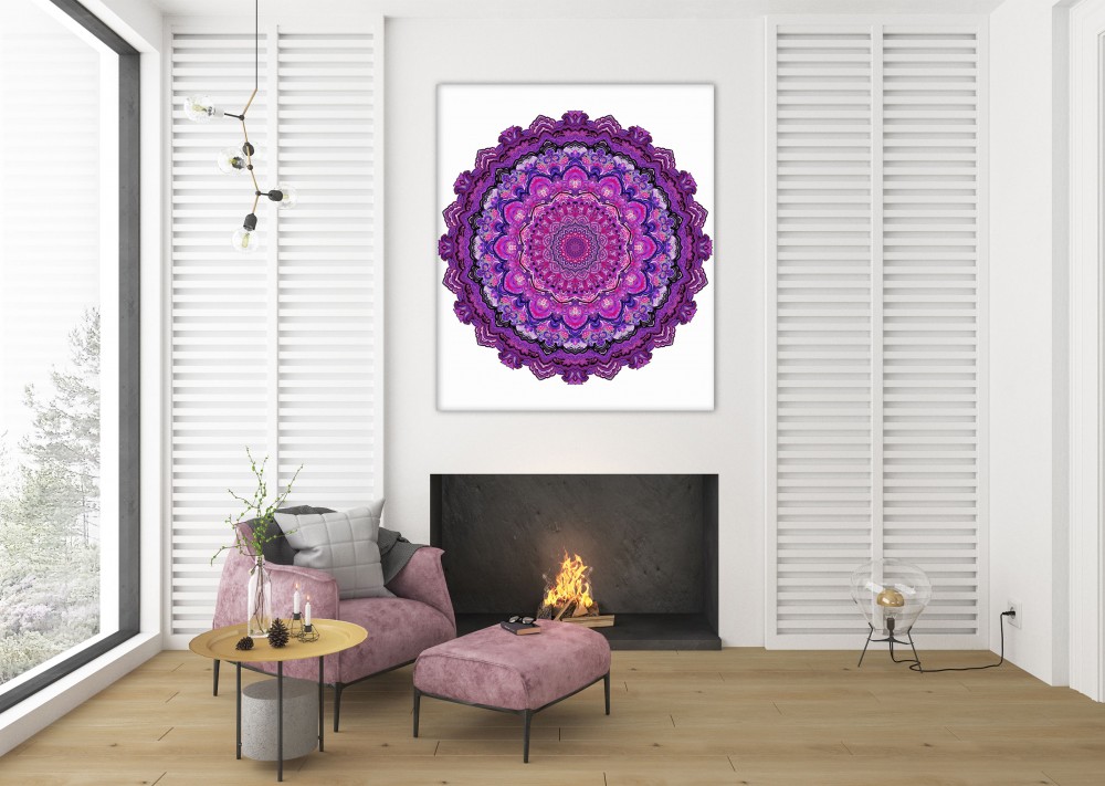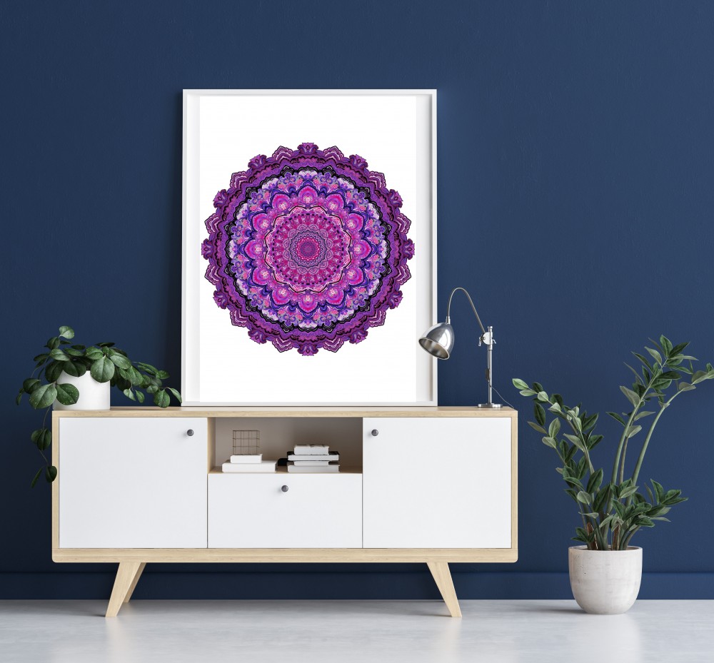 Autorski wzór mandali. Połączenie odcieni różu i niebieskiego na białym tle sprawi, że wnętrze będzie weselsze, ale również eleganckie i kobiece. Kolor fuksjowy jest żywy, ciepły, bardzo kobiecy i przyciągający uwagę.